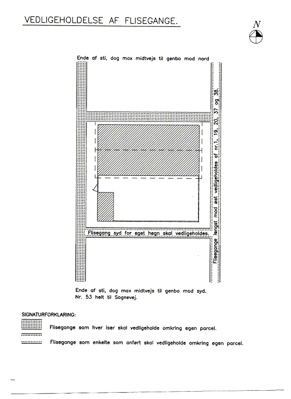 Du skal endvidere vedligeholde flisegangene omkring egen parcel i overensstemmelse med regler om "vedligeholdelse af flisegange". Vedligeholdelsen omfatter foruden renholdelse og opretning af fliser, også snerydning og foranstaltninger mod glat føre.